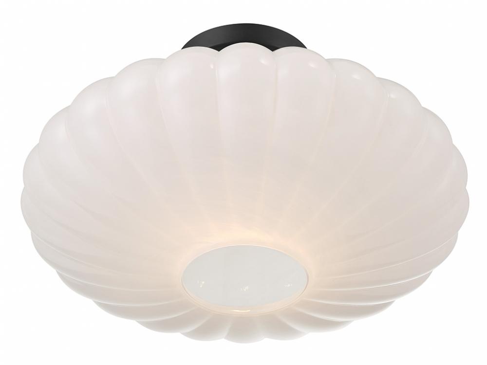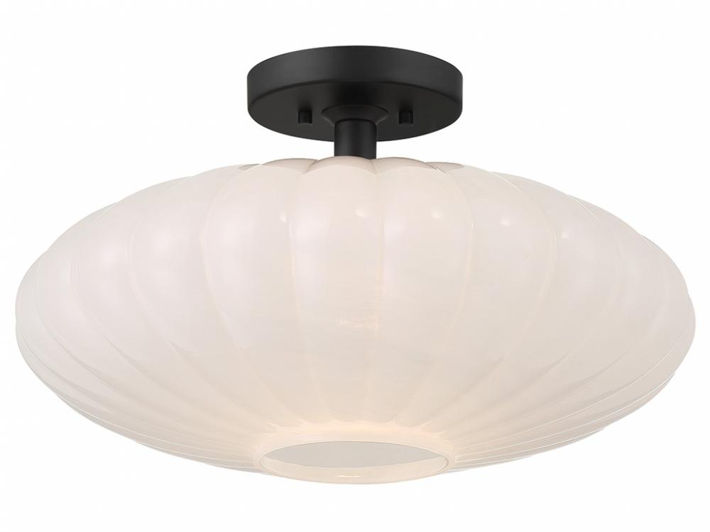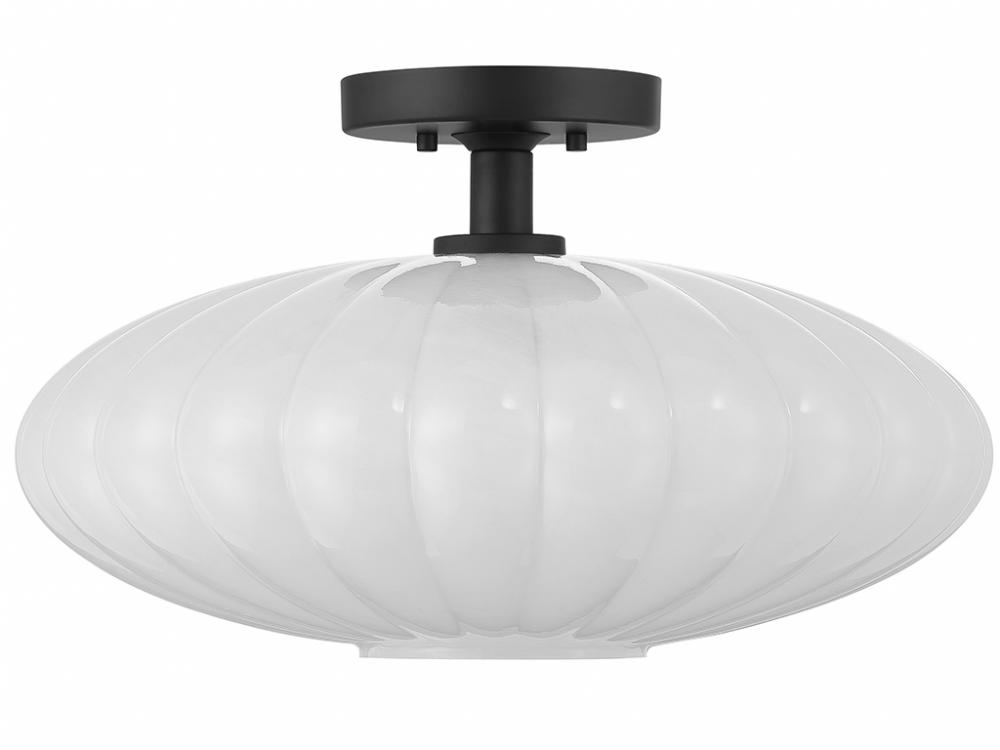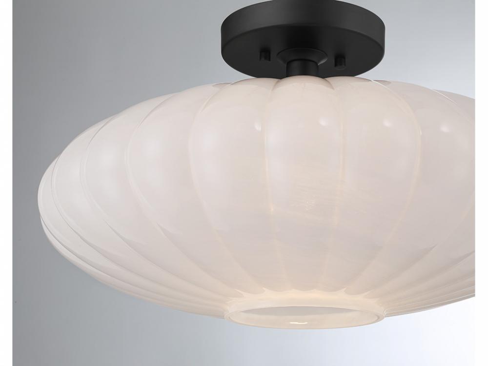 This 1-light ceiling semi-flush mount is an excellent way to boost the illumination in any room. Its ribbed white strie glass shade has a look inspired by the beauty of paper lanterns. The strie glass features dazzling swirls that draw the eye, soften the glow and work beautifully with the Matte Black finish. This ceiling light is 11" in height and 18" in width. Uses 1 standard size bulb of up to 60 watts. Bulb not included.