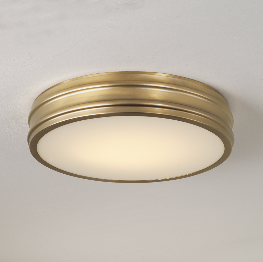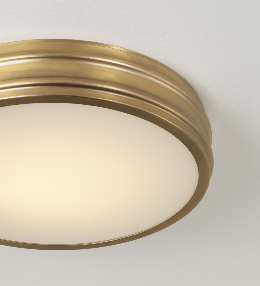 DETAILS: Surrounded by a double-rib Aged Brass band, the Soft White glass diffuser brings an ambient glow to any space. Complete with integrated LED technology for maximum impact in a low profile silhouette.