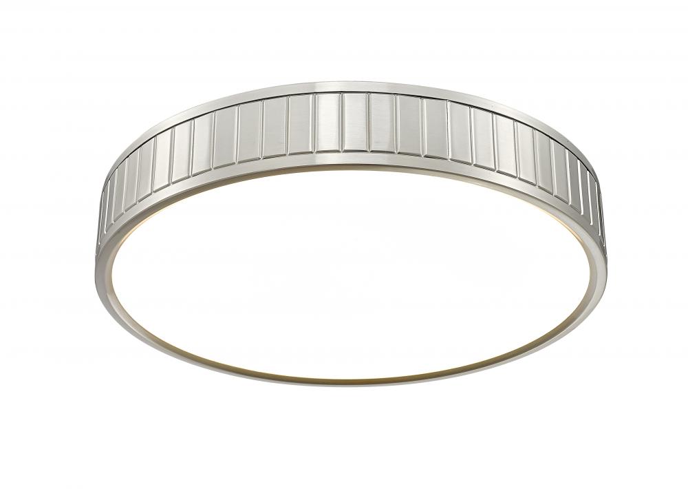 Illumination glowing from above adds stealth yet stylish aesthetics in this one-light flush mount ceiling light. Steel construction forms a ring canopy with a brushed nickel finish and vertical slats nestling a frosted acrylic diffuser that infusing optional and changeable white-color values to light up a modern kitchen, dining room, or foyer.