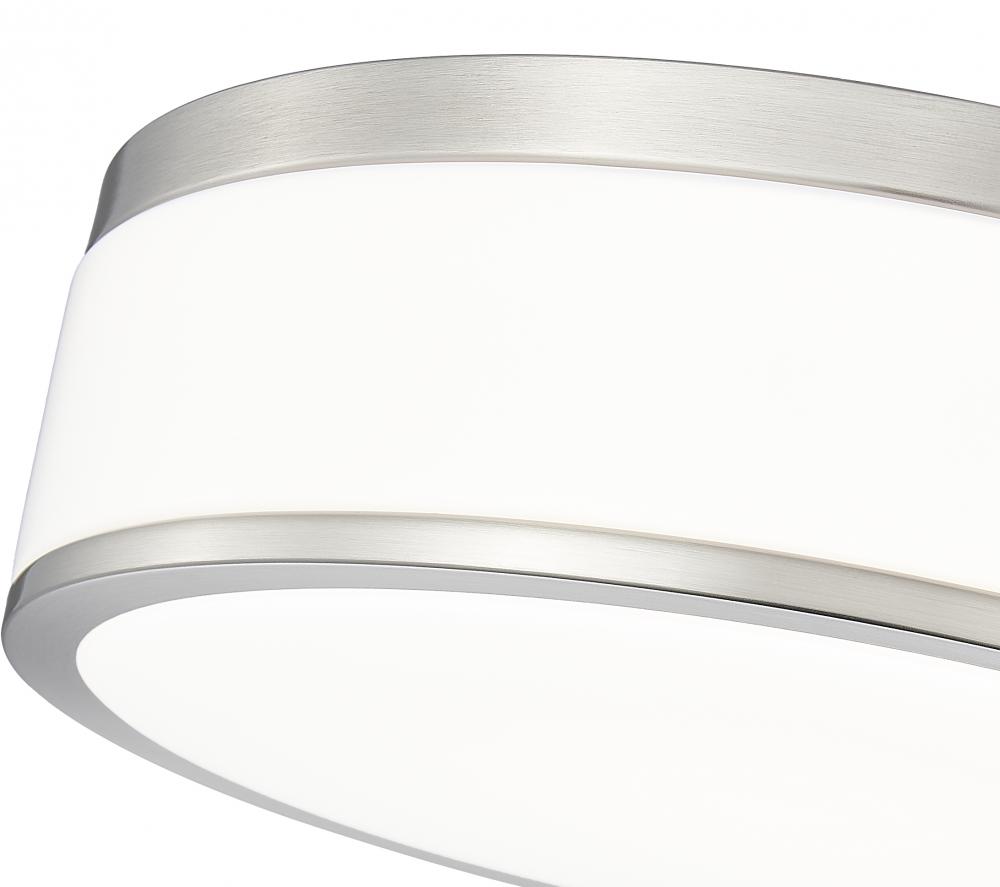 Chic metallic banding in brushed nickel pairs with frosted acrylic for a stylish look and soft illumination from this modern flushmount LED ceiling light. Its a fit for contemporary living spaces and bedrooms, offering a refined but understated style. The fixture is dimmable, assuring ambient illumination to suit every occasion.