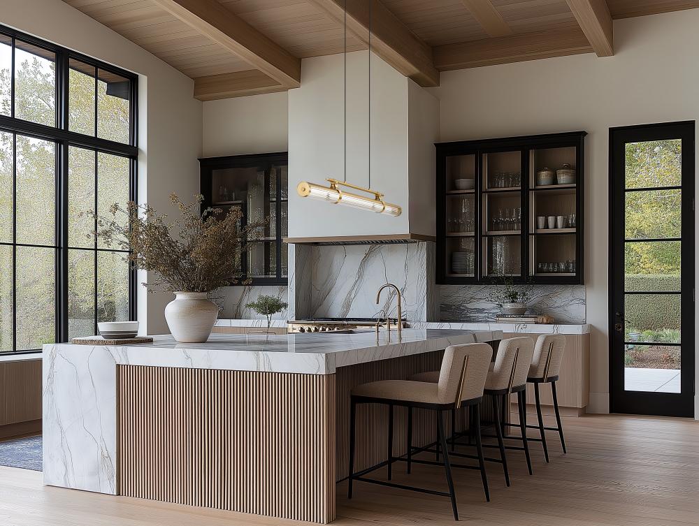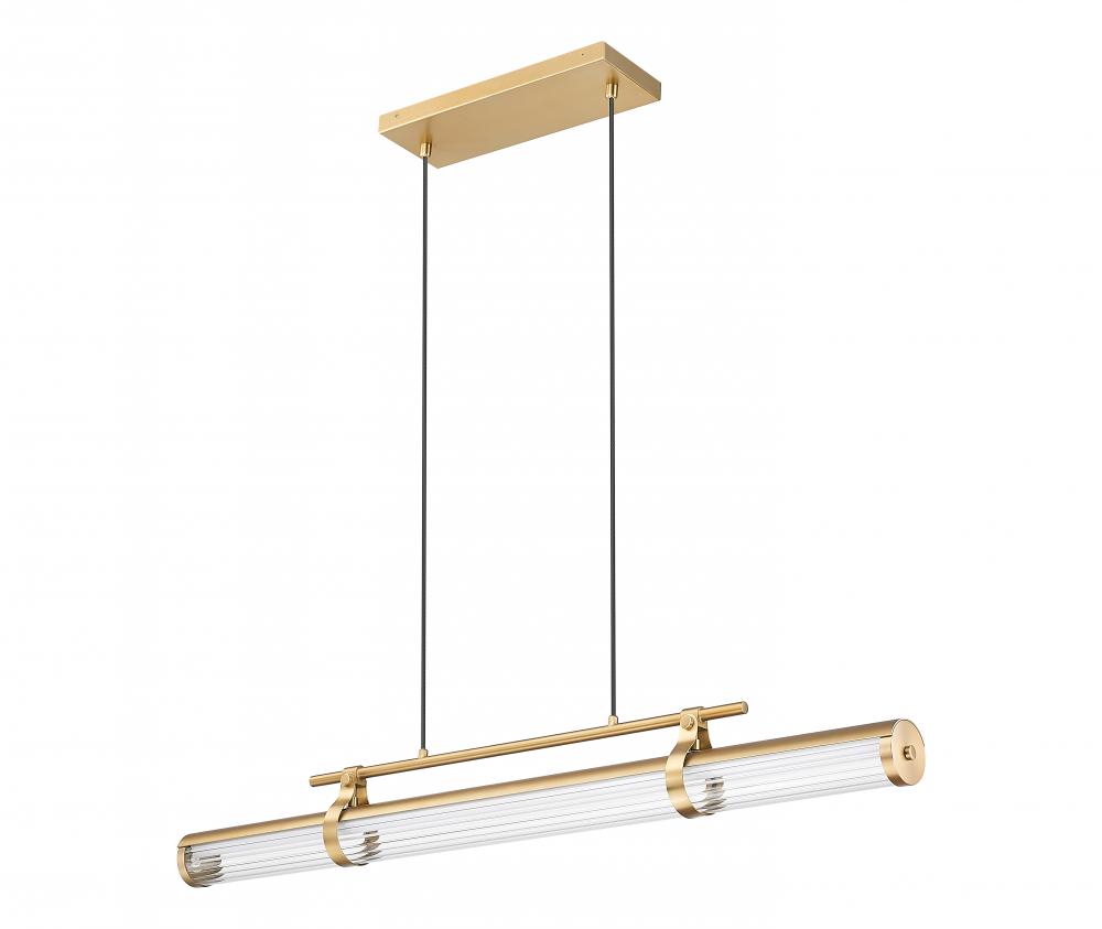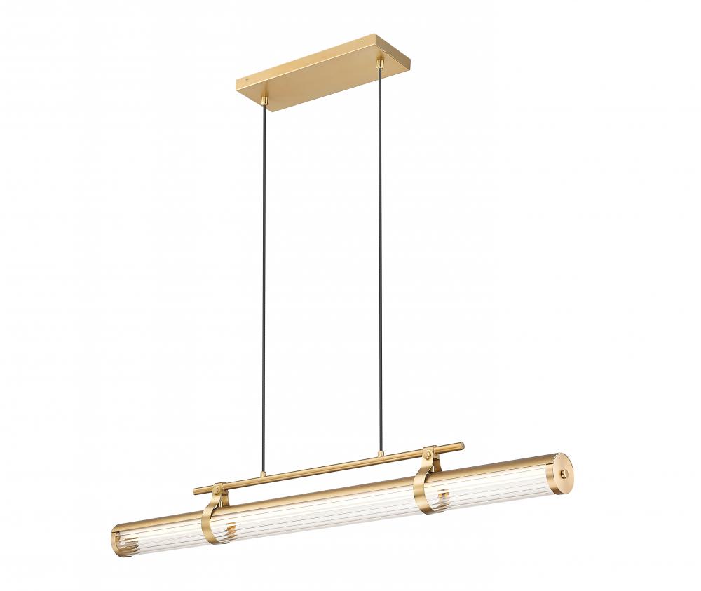 An airy, light presence embellishes the modernist look with deco influence as this single-light linear chandelier makes a design statement. Timeless style sends LED lighting through a clear reeded glass cylinder shade with dimming features, and lifts elegance with its modern gold finish metal framing. Cable suspension and chic accent details offer a new twist in lighting for an updated look.