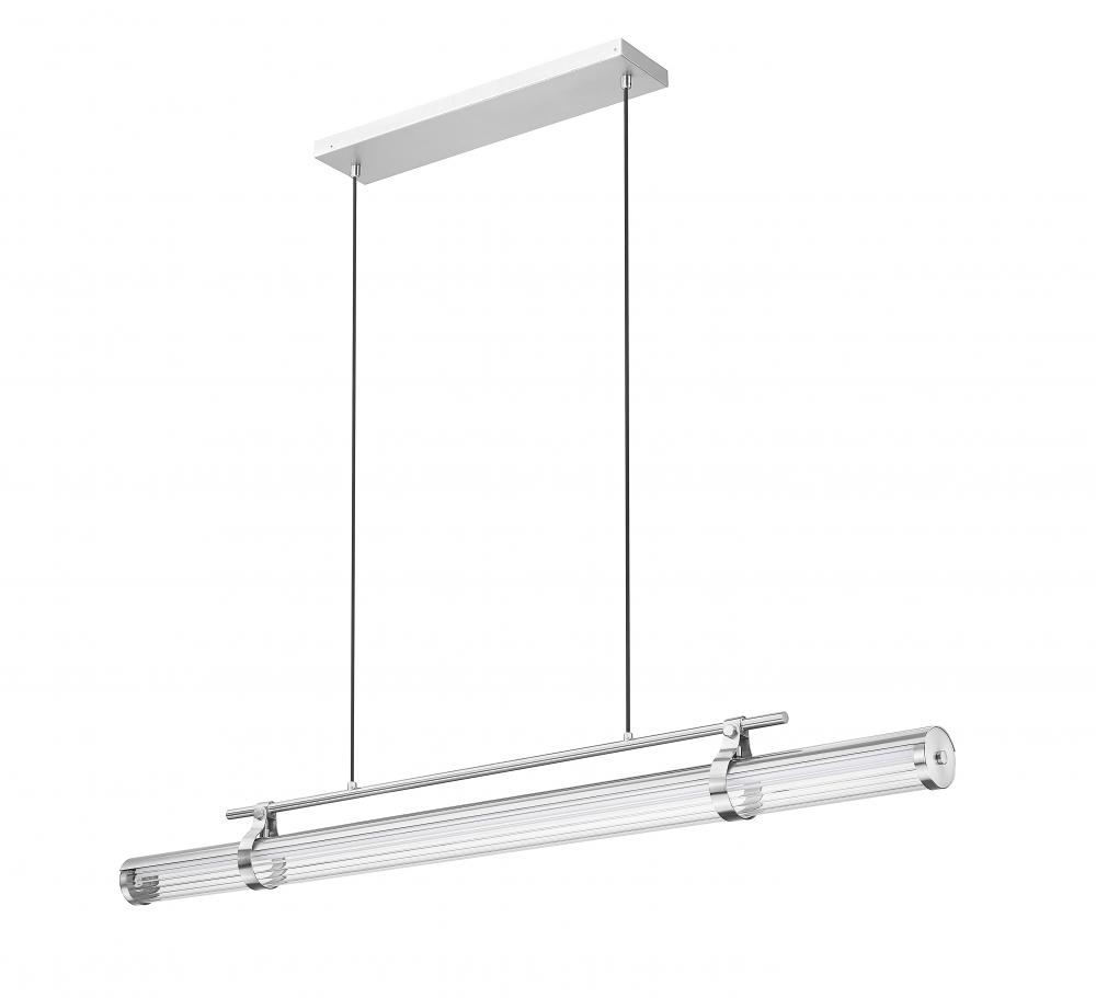 Ornate artistry transforms a classic look of industrial design as this one-light linear chandelier reflects both aesthetic beauty and precision performance. Framing of brushed nickel finish metal follows cable suspension in an LED luminaire meant to enchant, with dimmable lighting and a clear reeded glass cylinder shade offering variable color lighting levels.
