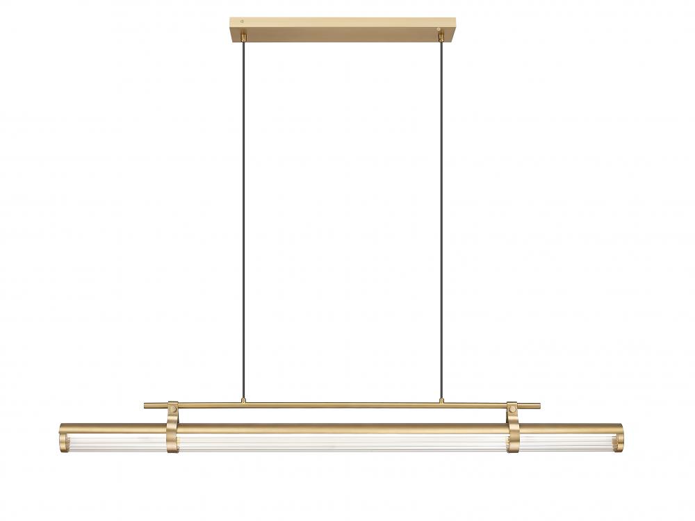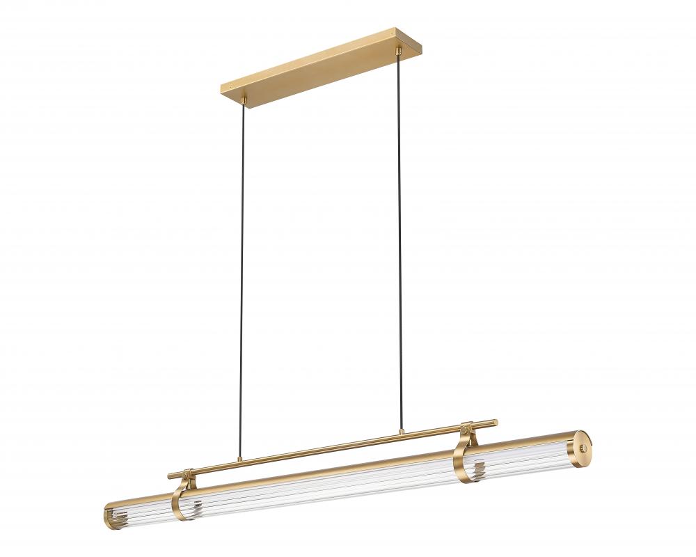 Warm modern gold finish metal sets up a decadent look to a one-light linear chandelier adopting a mix of industrial and deco style. Top an island or other horizontally oriented space with a cable-suspended LED luminaire offering rotatable adjustments of its clear reeded glass light source with tasteful framing and accents. Dimmable light levels are perfect for creating precise illumination.