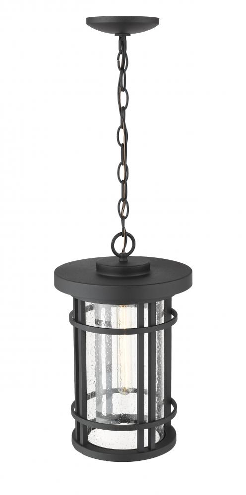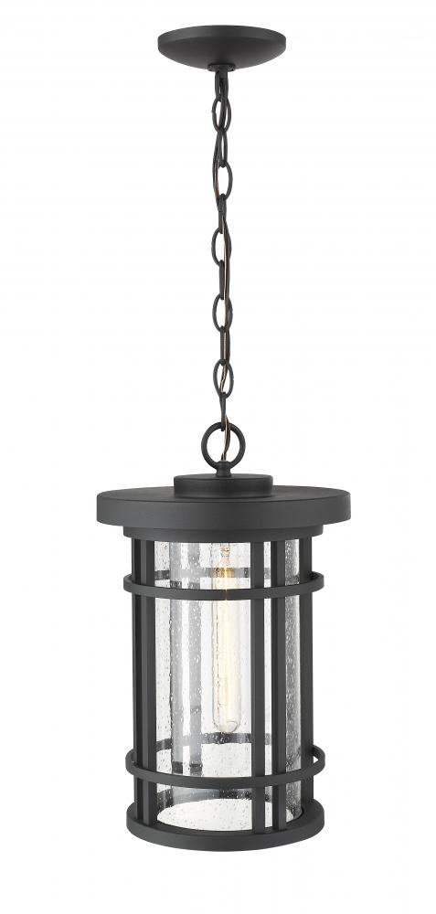 Thoughtful detailing yields an artistic flavor that enhances a gazebo or exterior bar space. Bring this black finish outdoor hanging lantern into the mix, buoyed by an eye-pleasing round silhouette and clear seedy glass panels.