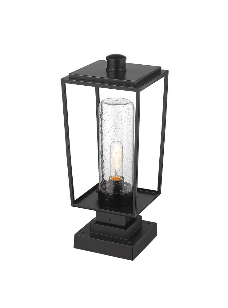 The Sheridan one-light outdoor pier mounted fixture creates options for stylizing a custom landscaping space or walkway. Indulgent village charm follows a transitional design with an open frame fashioned of black finish aluminum & steel and a matching stacked base. Enjoy the soft glow of ambient lighting emanating from a romantic seedy glass cylinder shade offering a filtered view of a simple bulb base.