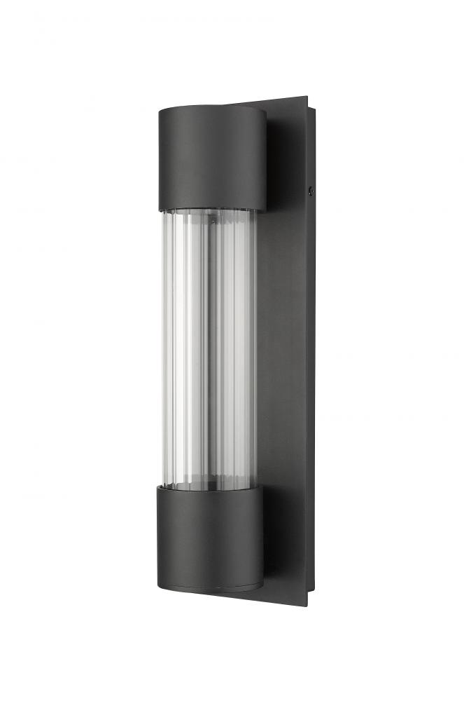 A small wall sconce lends modern appeal with a black finish and clear optic glass diffuser. Offering a cylindrical silhouette, the light is a beautiful addition to contemporary or industrial-inspired decor.