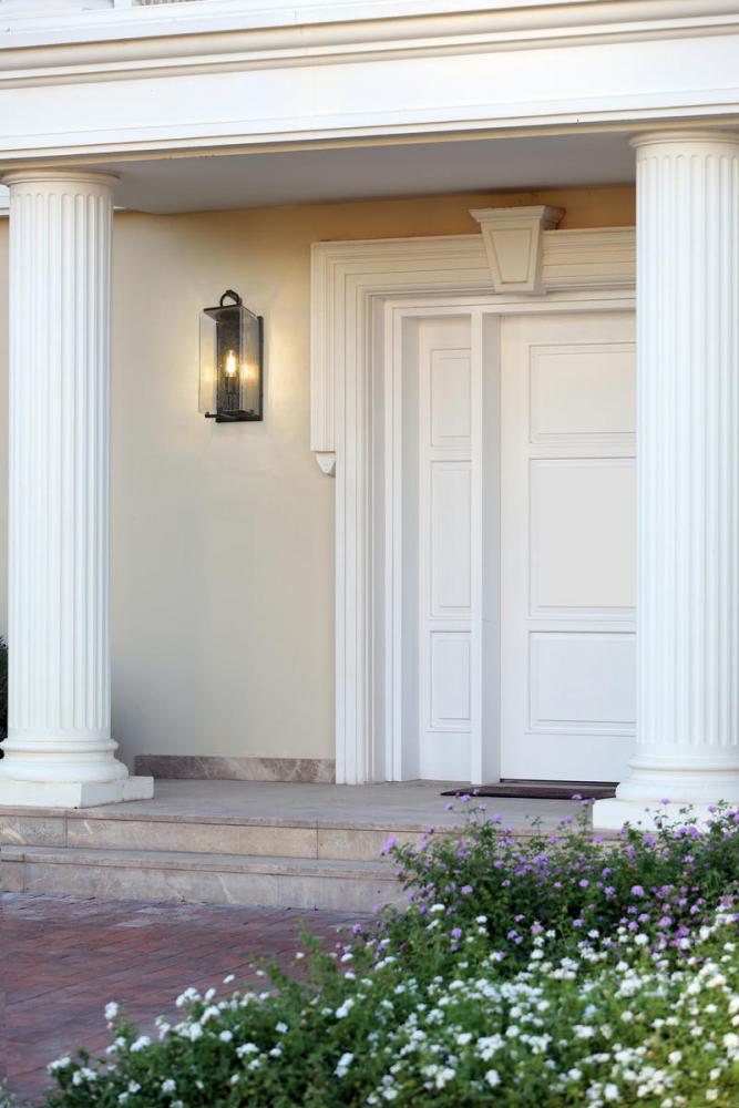 A lovely lantern-inspired silhouette leads to a one-light outdoor wall light thats suitable for contemporary or coastal exterior decor. Finished in black, this piece features candelabra style bulbs and a seedy glass shade for visual appeal.
