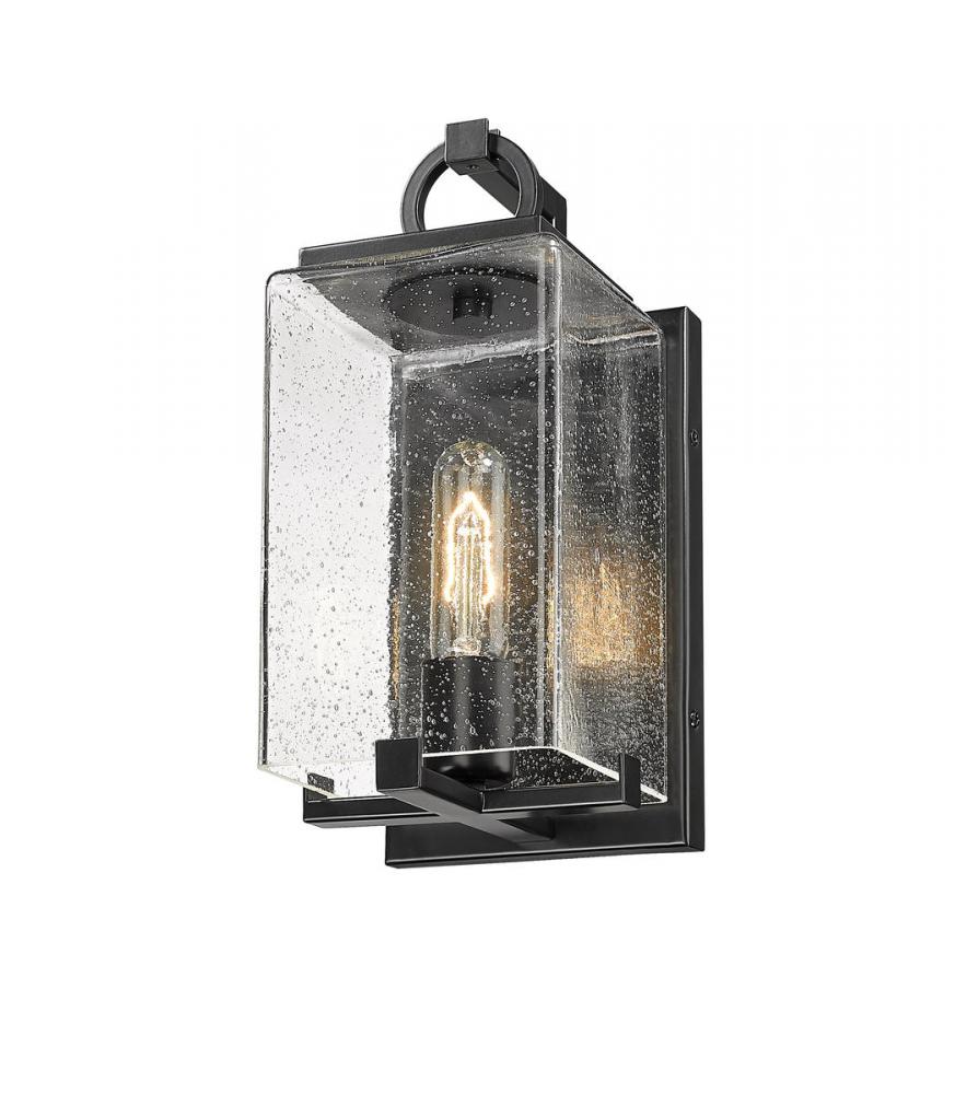 Light up your outdoor space with this coastal outdoor wall sconce with a lantern-like silhouette. This fixture features a black finish and seeded glass shade with candelabra bulbs. Feature this wall sconce on your deck or patio for immediate illumination.