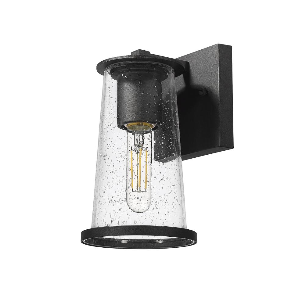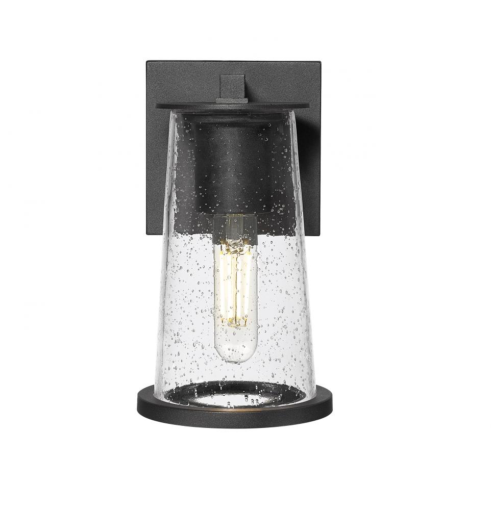 A modern outdoor wall light from the Bar Harbor collection is a striking addition, offering a cone of seedy clear glass thats bold but timeless. Simply charming flanking a garage or front entryway, the light boasts a lantern-inspired silhouette streamlined for a contemporary ambiance that overflows with character. A marine-grade sand black finish is lasting and built for durability in outdoor environments, perfect for virtually any space.