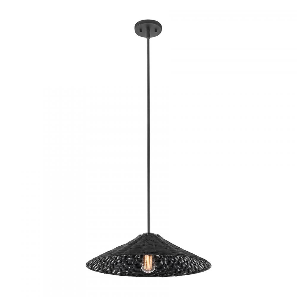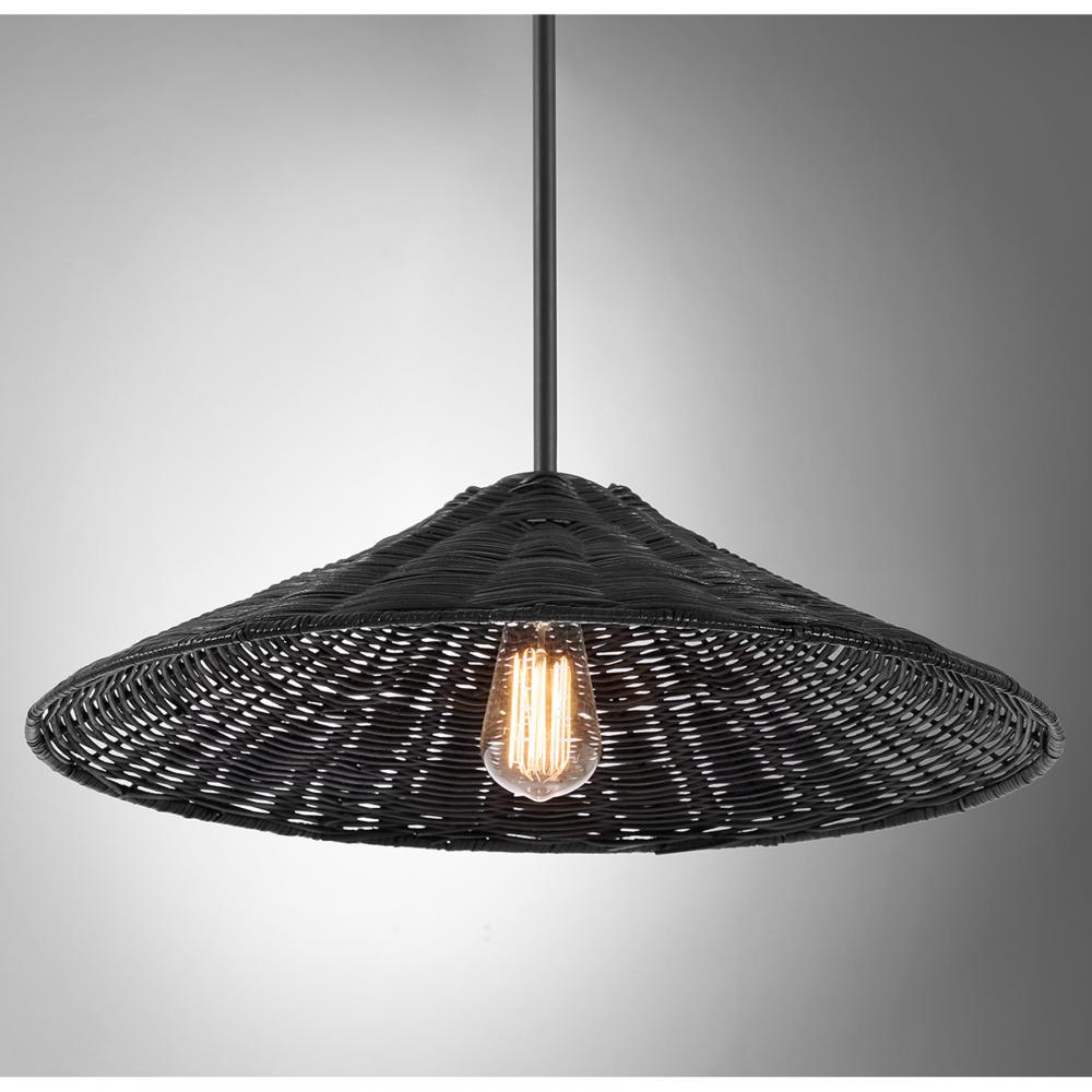 Add a relaxed, natural vibe to any room with this chic 1-light pendant. It flaunts a highly textured shade of natural rattan that is finished in black to match the fixture's Matte Black finish, bringing in a bold and fashionable flair. 5" height and 20" width. Uses one standard size bulb, max 60 watts. LED bulb compatible. Comes with four 12" downrods and one 6" downrod.