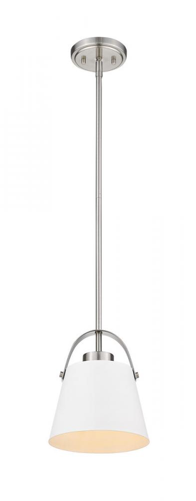 Incorporate design-forward illumination into a decadent contemporary d?cor scheme with this gorgeous one-light mini-pendant. Bring targeted lighting to a compact nook or reading space with a sleek fixture fashioned from Matte White and Brushed Nickel finish metal, with a classic angled shade.
