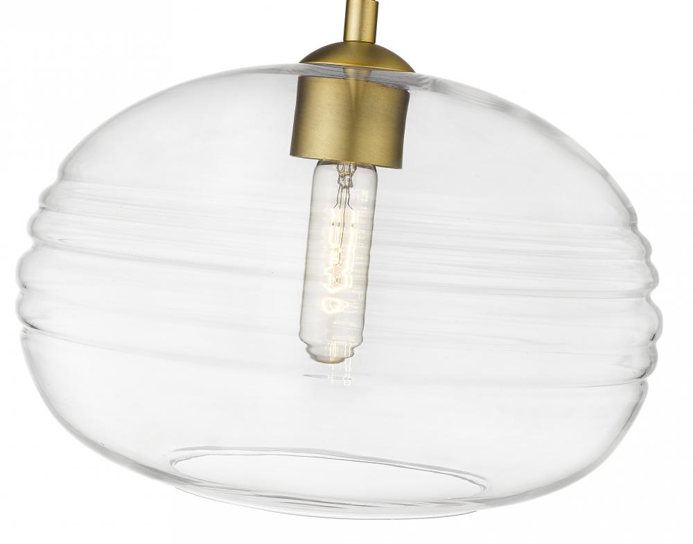 Express your modern aesthetic with this eye-catching one-light pendant. The grooved, rounded shade is made from clear glass, suspended from a steel frame with an olde brass finish. The fixture brings a chic cutting edge to a contemporary kitchen or dining room.