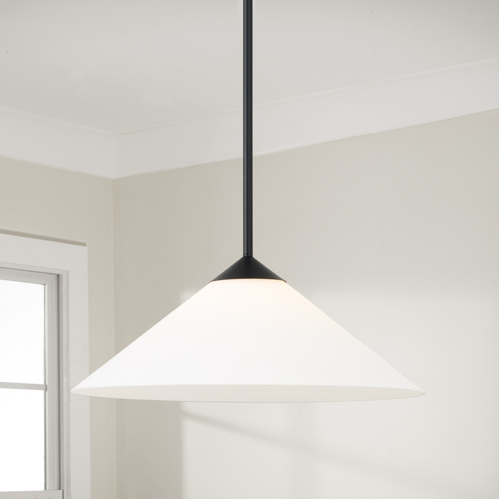 DETAILS: In a distinct cone shape, the Soft White glass brings ambient light through the sharp silhouette, complete with a Matte Black finish and a tapered designer canopy for elevated style in any space.