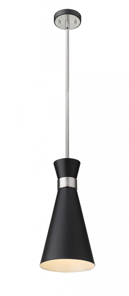 A decorative, slender silhouette shapes industrial influence that adds casual elegance to this matte black finish metal pendant light. Dress up a main living space or entryway with this tasteful fixture trimmed with brushed nickel finish steel. This sleek pendant captures the heart of romantic industrial charm.