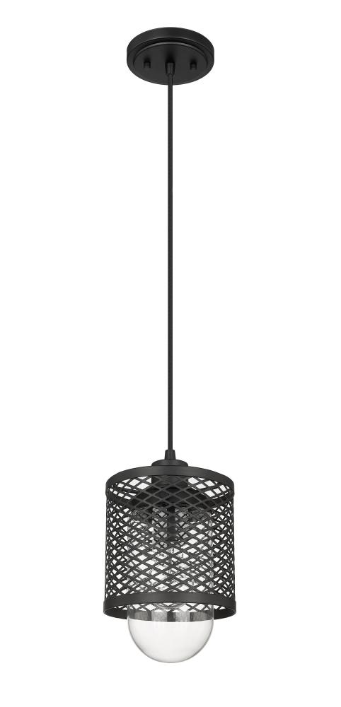 Add a vintage-inspired feel to modern farmhouse kitchen interiors and inviting countertop spaces with this transitional mini light pendant. Suspended from a steel metal rod and ceiling mount, a matte black cage offers a mesh lined surface for a highly texturized look that scatters light across tablescapes and offers an old-world aesthetic. Tucked inside the black mesh cage pendant is a clear glass shade with a rounded edge that peeks out, revealing timeless Edison-style filament bulbs.
