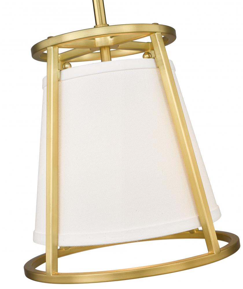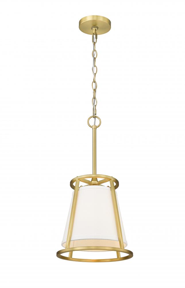Decadent rubbed brass finish steel forms an openwork lantern-style frame, adding lightness and elegance to this mini-pendant by Lenyx. This tasteful fixture becomes a source of targeted lighting for a compact reading nook or seating space. With a simple fabric shade providing light diffusion, this pendant adds iconic traditional attitude in any living area.