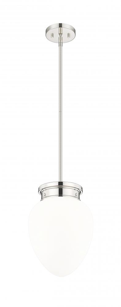 A chic silhouette is crafted with schoolhouse inspirations to bring vintage charm to a modern one-light pendant. Its timeless polished nickel finish complements in your kitchen or dining room, with the versatility to blend beautifully in a bedroom or den. Its teardrop-style shade is crafted from matte, etched opal glass to deliver soft, diffused illumination in any setting.