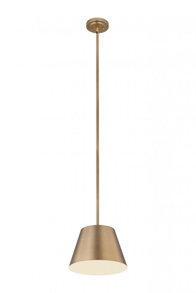 Chic in its simplicity, this modern pendant is a striking choice over a kitchen island, dining table, or living area. Refreshing in its modern gold with a white interior shade finish, the pendant features a compact profile with a round canopy and a modern empire shade that tapers gently to create versatile illumination.