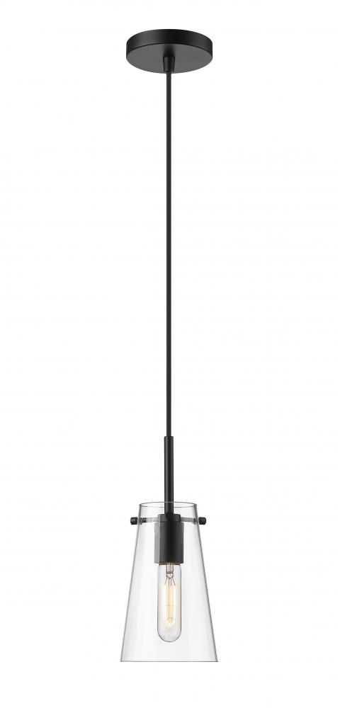 Clear glass defines a slim silhouette, bringing refined style to a modern one-light pendant. Its stately matte black finish sets the tone for a refined living space, kitchen or powder room. The gentle tapering cone silhouette of the pendant ensures its timeless look, perfect alone or in series lighting a larger space.