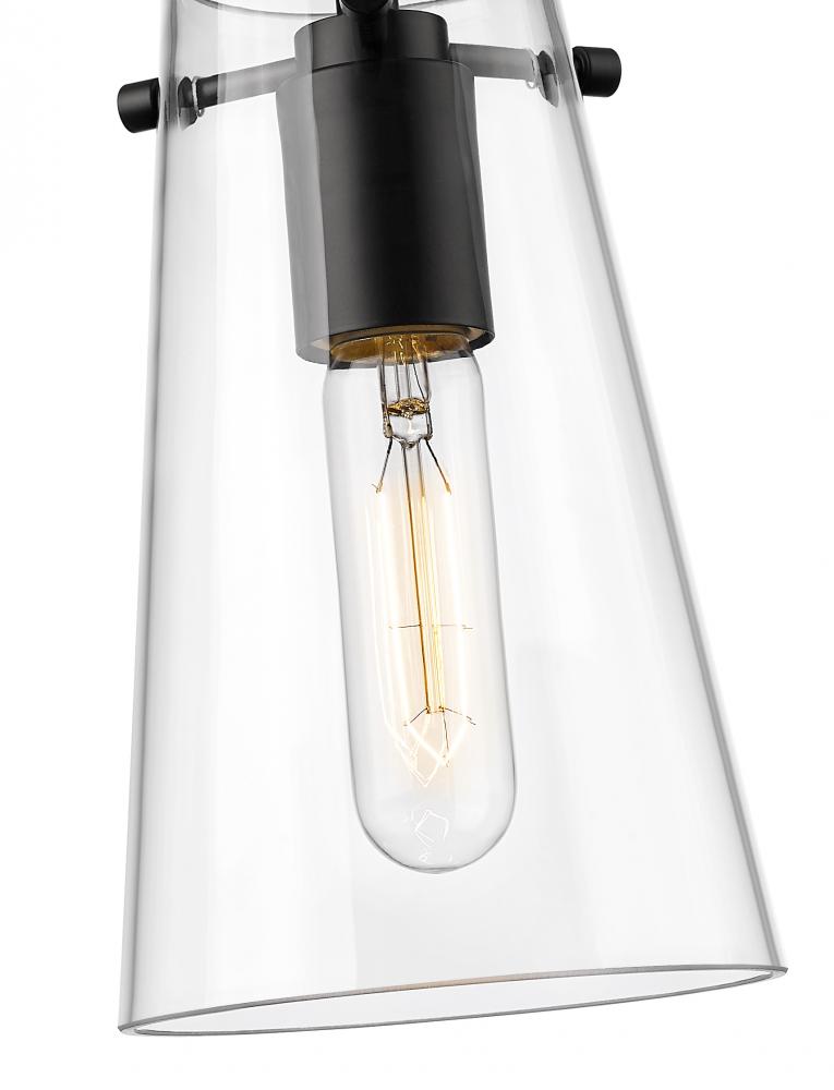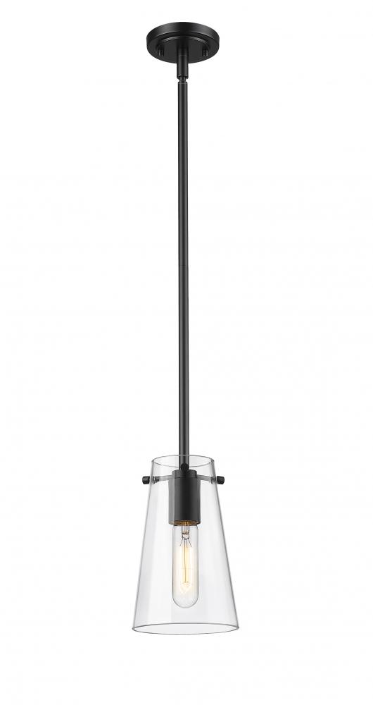 Infused with modern appeal, this one-light pendant pairs a stately matte black finish with a minimalist silhouette that clears the way for beautiful illumination. A conical shade of clear glass refracts light for bright lighting over a kitchen island or in your living area. Its simplicity is a highlight, perfect for a contemporary space that embraces understated refinement.