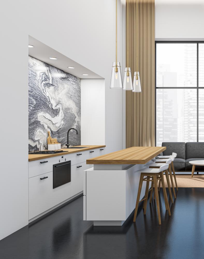 Minimalist design credentials are on full display in a modern one-light pendant. Pairing a cone of clear glass with a simple housing and suspension, the pendant is a gorgeous choice with understated elegance. Modern gold finish is a sleek touch, offering a refined look and feel in your kitchen or living area.