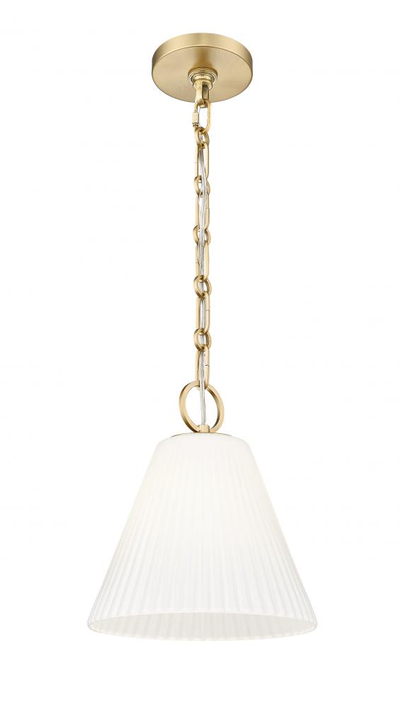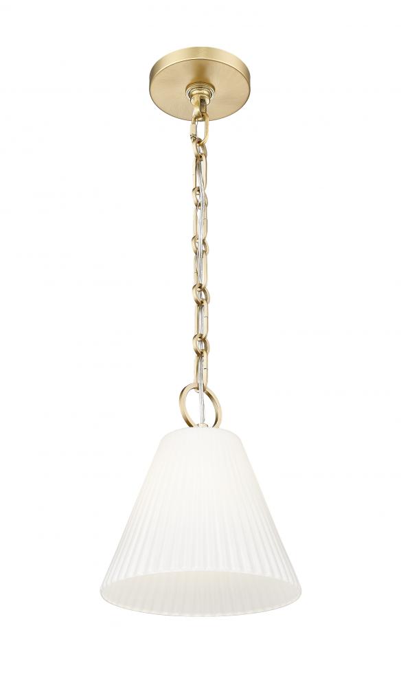 Soft fluting adds delicacy and movement to the conical shade of a modern one-light pendant. Beautiful glass pairs with a modern gold accent finish, creating a superb ambiance for a kitchen, living area, or bedroom.