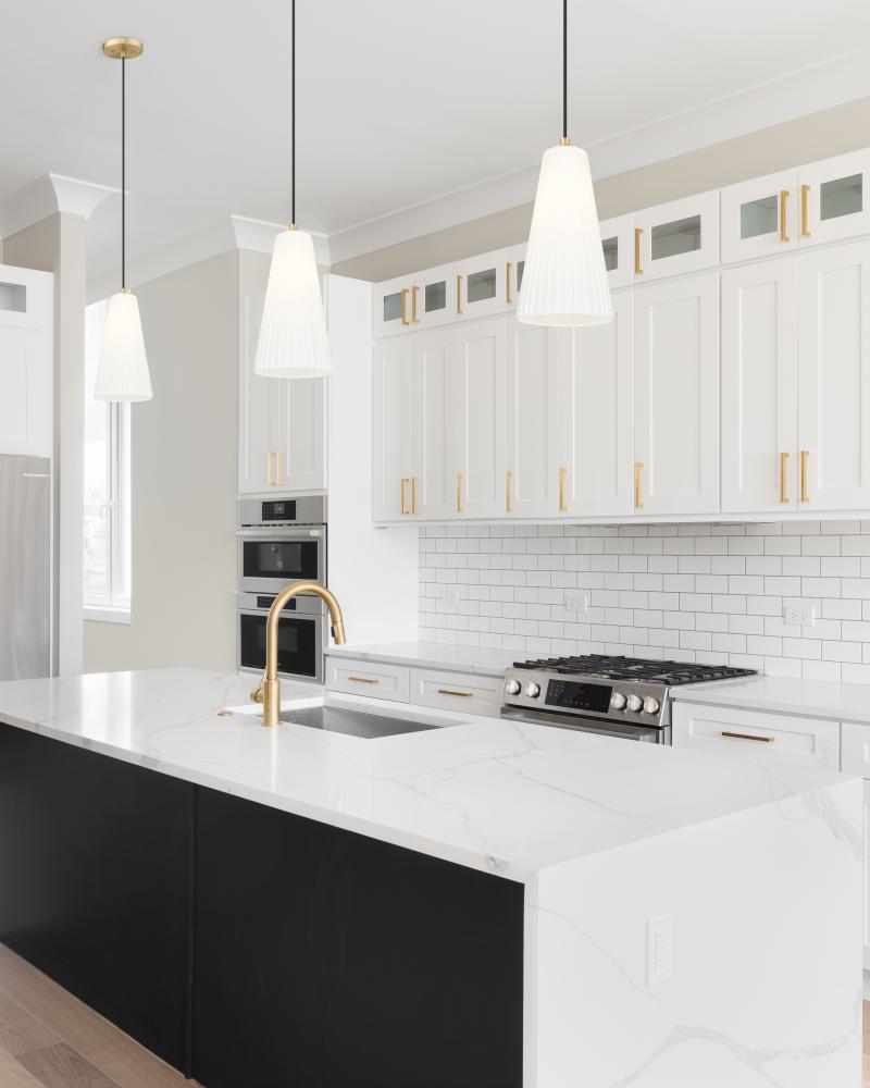 A rich modern gold finish creates a touch of warmth for a modern one-light pendant. Striking over a bedroom or living area, its a bold choice alone or in series to create a larger lighting installation. Its flared shade is crafted in frosted white glass, complete with fine fluting that creates the perfect hint of dimension and delicacy.