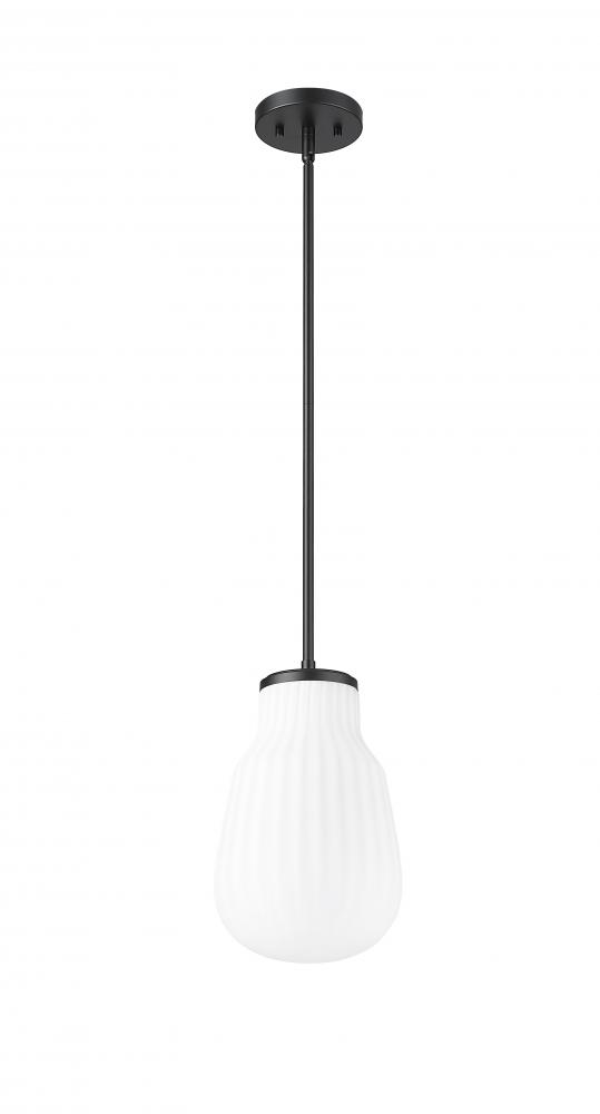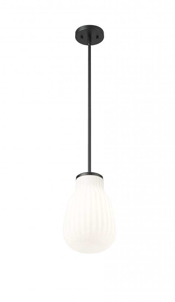 Update schoolhouse ambiance radiates from a modern one-light pendant. Its ribbed white glass shade adds inviting character to your kitchen or living room, while providing soft, diffused illumination. The pendant is adorned with a matte black finish down rod and canopy, creating bold contrast and depth for a stylish space.