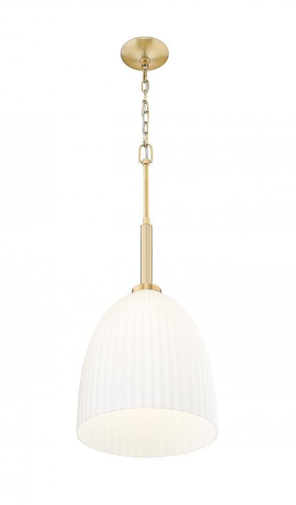 Elegant in its restraint, this one-light pendant offers a glowing matte opal shade suspended from a warm modern gold finish. Ribbed detailing gives the glass just enough texture to keep the light soft and dimensional. It?s an understated beauty that works as well in a row as it does on its own.