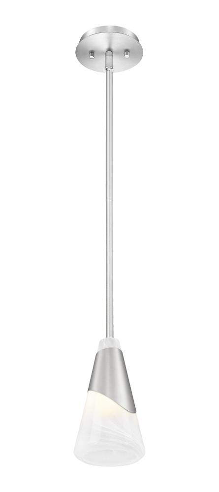 The cool curve of a metal shroud adds dynamic flair to this modern pendant light. Fashioned with a swirling art glass shade, it delivers bright, true illumination that lends impeccable ambiance to kitchens, baths and living areas. A brushed nickel finish gleams in the light, complementing the canopy, downrod, and shroud to perfection.