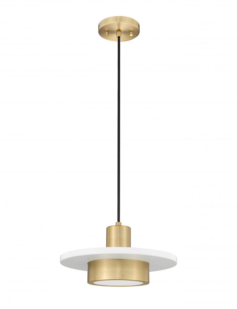 Keeping it simple, this art deco inspired one-light pendant leans on a geometric silhouette with cylinder shapes intersected by a matte white disc for good measure. Modern gold finish steel construction includes a round canopy, with a bold black suspension cord offering dimensional quality. Take advantage of dimmable LED illumination flowing through a frosted acrylic glass shade.