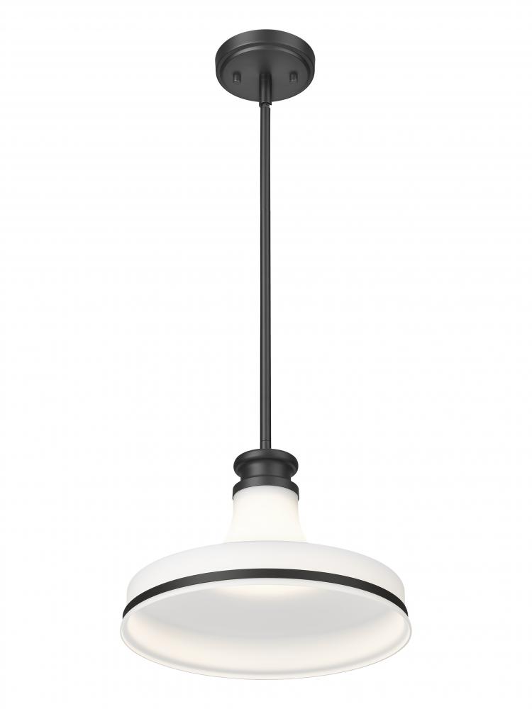 Chic contrast in a standout palette becomes a focal point in a single-light pendant youll want to explore. Mixing deco, industrial, and artisan, this retro-inspired fixture offers bold matte black framing and a scintillating matte opal glass shapely shade, all coming together to create a visual delight. Highlight dining spaces, kitchens, and foyers with a dimmable fixture blessed with mood-altering variable light levels.