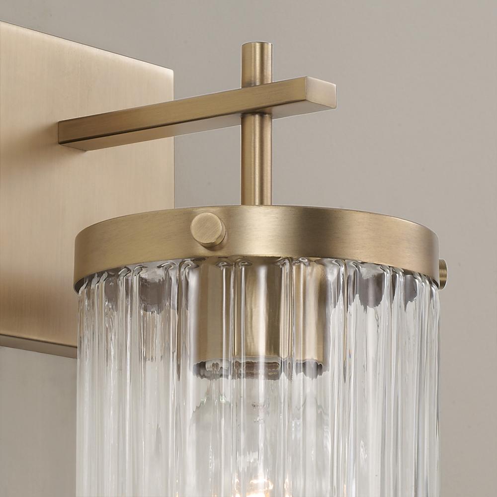 Invite stunning illumination to any space with the Vaughn Sconce. Held by sleek, intersecting arms, the Beveled Fluted glass creates captivating texture against the cylindrical silhouette, while the Aged Brass finish offers a versatile, timeless aesthetic.