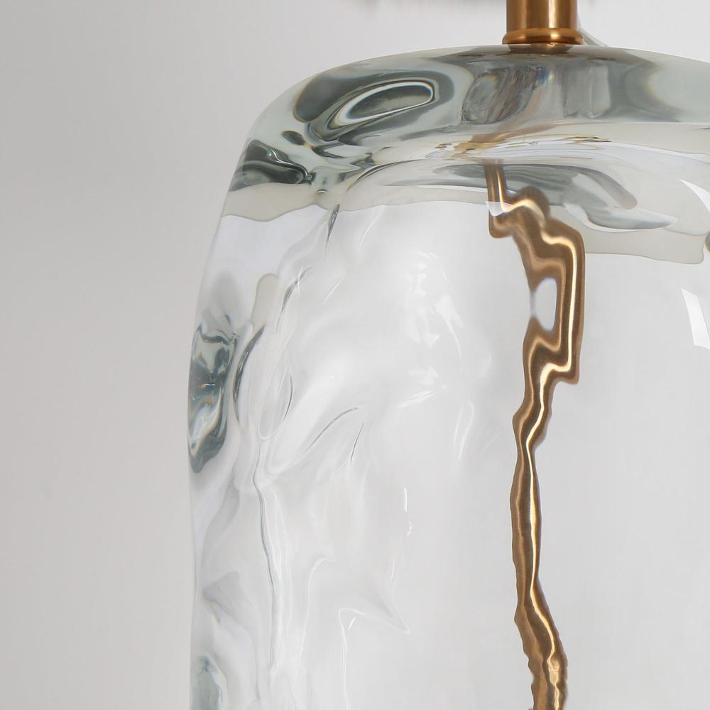 This shapely, textured glass table lamp paired with a white linen drum shade is a classic addition to the home. And it is a beautiful piece to display in any space.