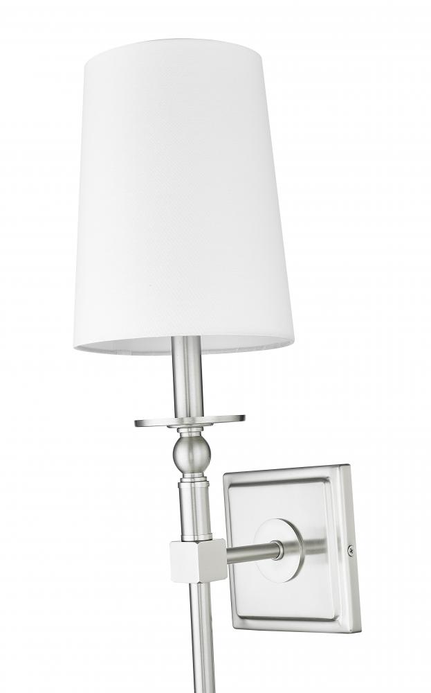 Features a white fabric shade