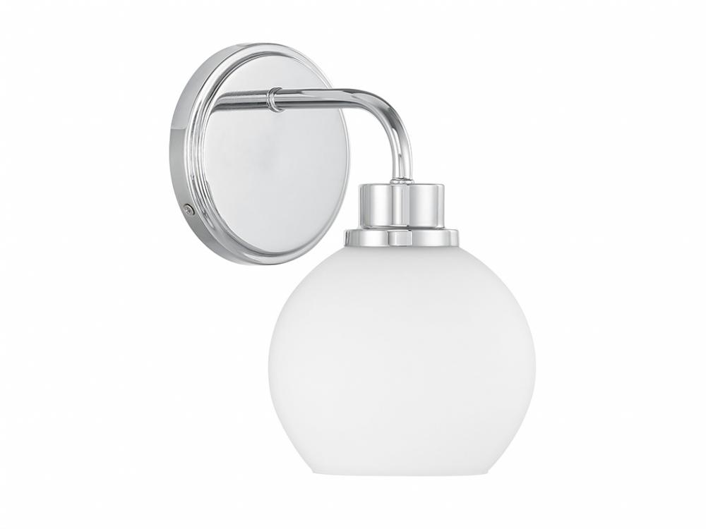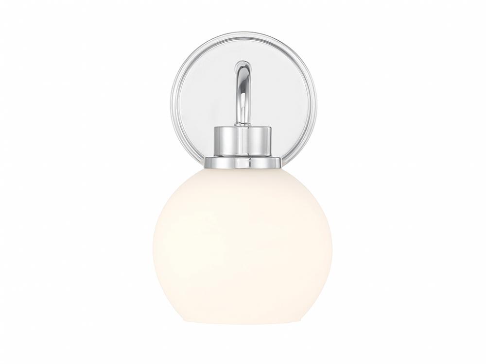 Freshen up your bathroom with the sleekly timeless style of this 1-light sconce, which features an orb-shaped shade of white opal glass that is open at the bottom and a versatile Chrome finish. It is 9.5" in height, 6" in width and extends 7.75" from the wall. It uses 1 standard size bulb of up to 60 watts. Bulb not included.