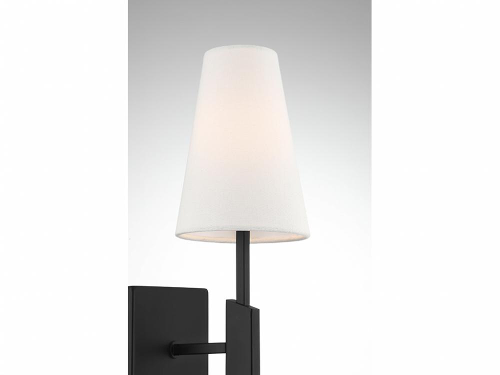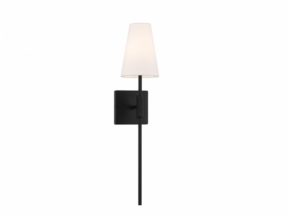 If you want to add a touch of chic, classic style to any room, look no further than this 1-light sconce. Finished in Matte Black, pairing a pencil-sleek body with a bold square backplate and a white linen fabric shade, it is great whether used solo or in groupings. This sconce is 24" in height, 5" in width and extends 6.5" from the wall. It uses 1 candelabra size bulb of up to 60 watts. Bulb not included.