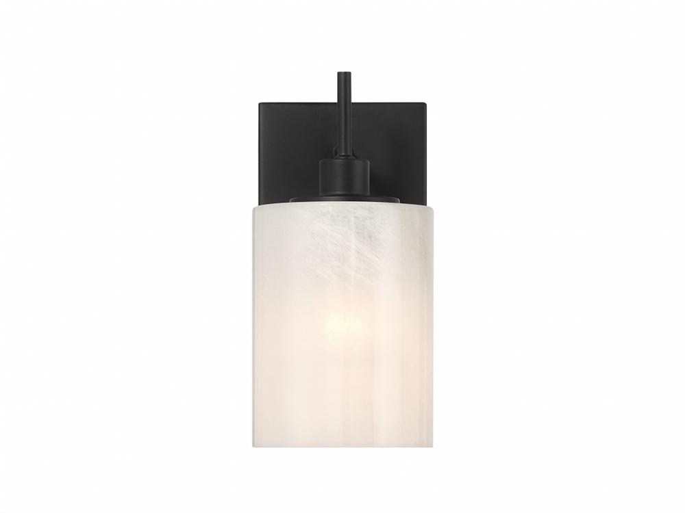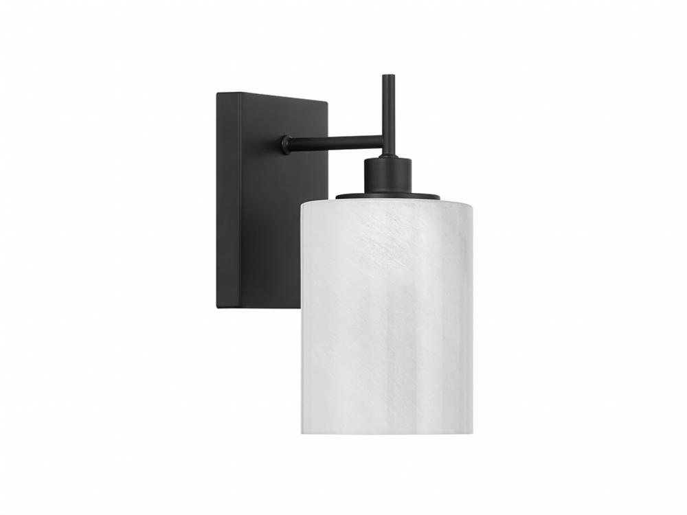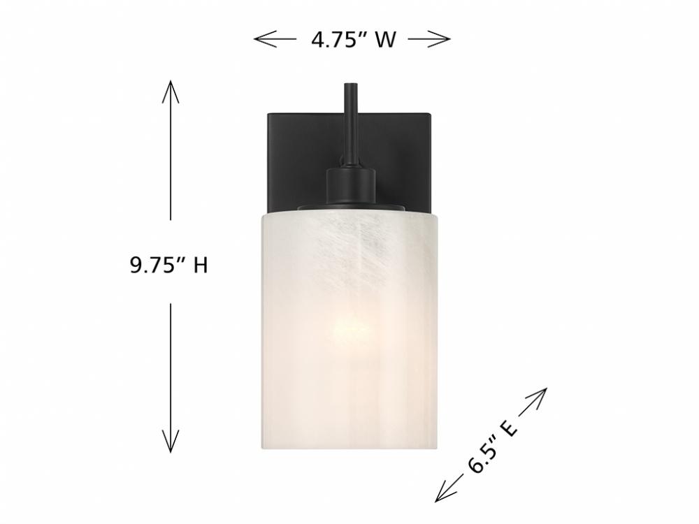 Pep up any room with this simply beautiful 1-light sconce! Its centerpiece is a shade of strie glass featuring dazzling swirls that draw the eye, soften the glow and work beautifully with the Matte Black finish. It is 9.75" in height, 4.75" in width and extends 6.5" from the wall. Uses 1 standard size bulb of up to 60 watts. Bulb not included.