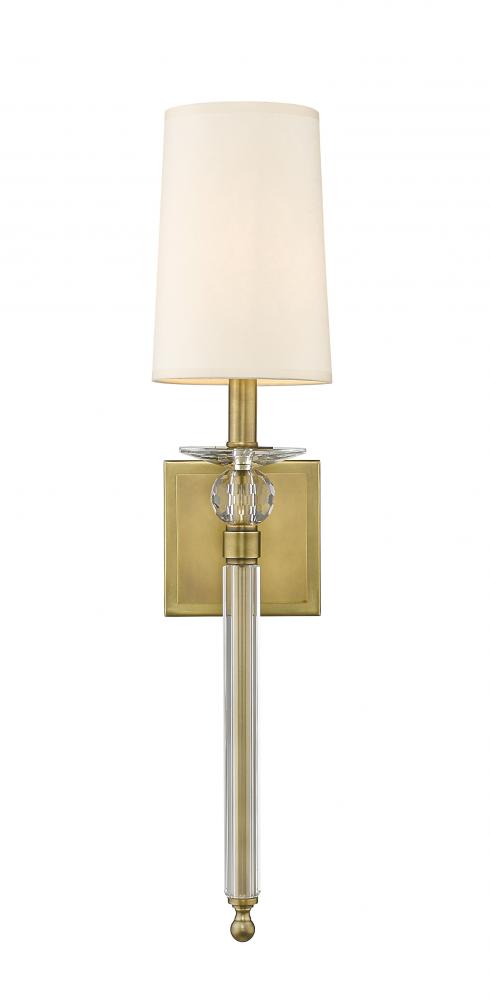 Capture the upscale elegance of a wall-mounted fixture that delivers ambient lighting as it updates the look of a bathroom, bedroom, or hallway. Made from rubbed brass finish steel and crystal, and topped with a sleek beige shade, this one-light wall sconce embellishes a classic design scheme with a traditional lamp motif and artistic crystal accents.