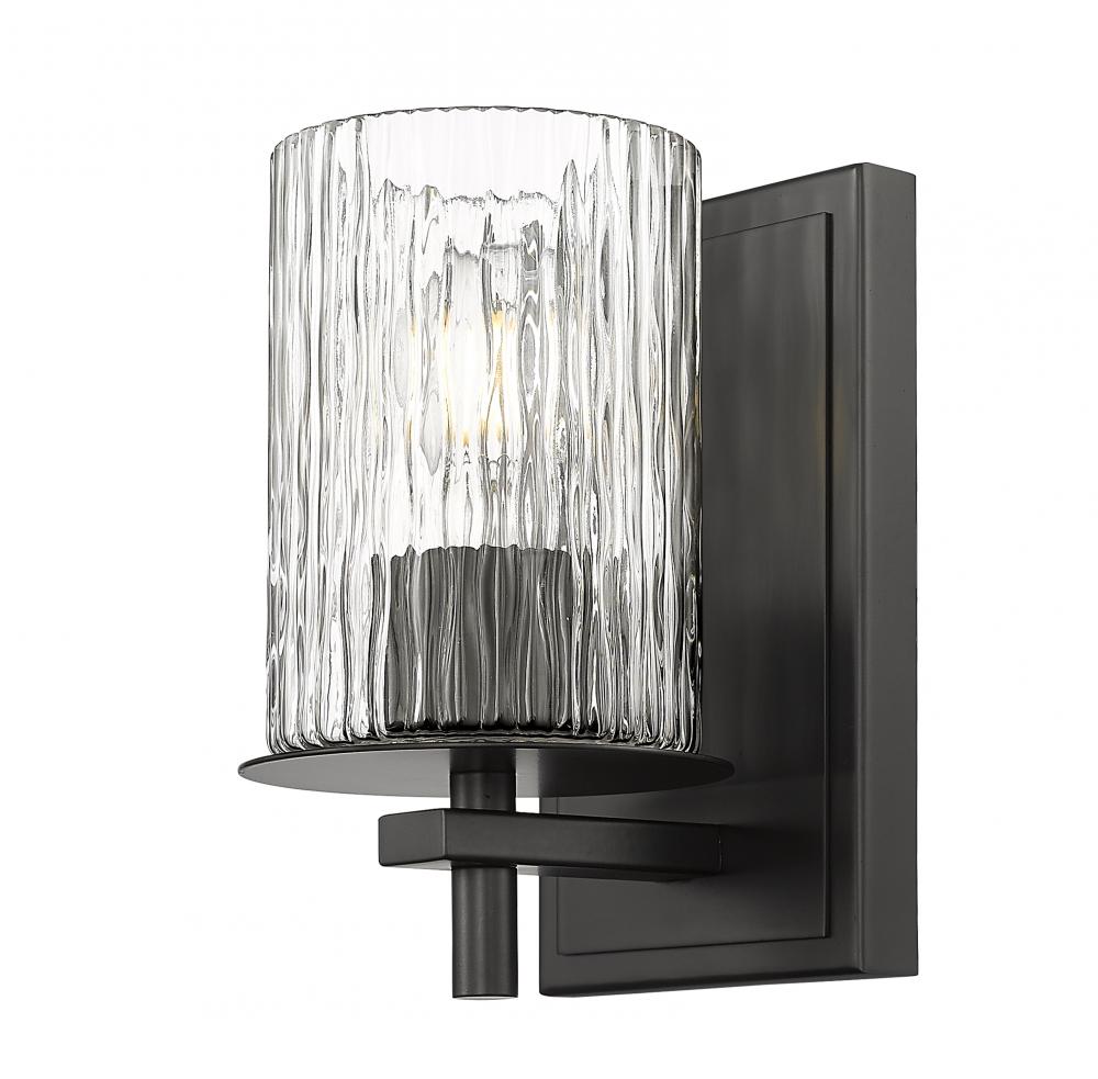 A sleek layered design blending glass and steel begins a look of elegance in this one-light wall sconce, a great option for contemporary bath spaces. Intricate detail is textural and artisan with clear glasswork in a cylinder shape, with an inner white diffuser. Etched opal and clear glass blend as they enhance bold matte black finish framing and show off a crisp mix of circles and lines.