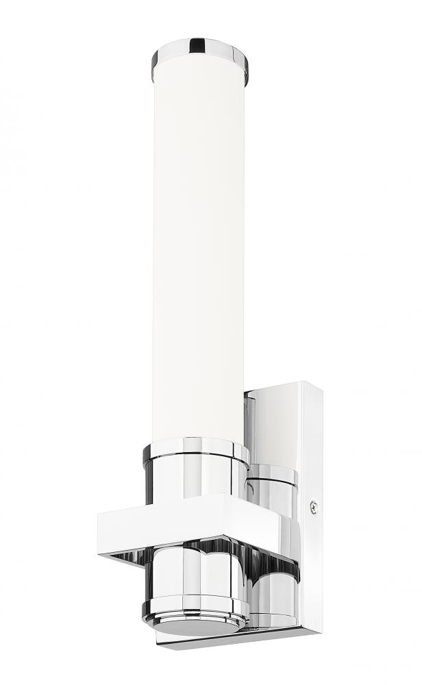 Easily adapting to any setting, this modern LED wall sconce pairs subtle decorative details with a gleaming chrome finish. Its torch-inspired silhouette is complete with a cylindrical opal glass diffuser, casting soft, glare-free illumination thats perfect for halls, living areas, baths, and bedrooms within your home. The integrated LED is an energy efficient choice that adds dimmability and color selectability to this charming design.