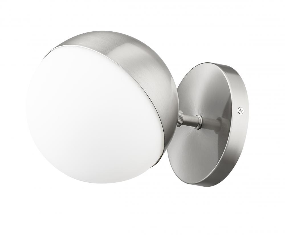 A moveable metal shield adds the ultimate flexibility to this mid-century one-light globe wall sconce. Its lovely matte opal glass orb shade casts soft, inviting illumination, while its simple framework receives a brushed nickel finish that brims with stylish versatility.