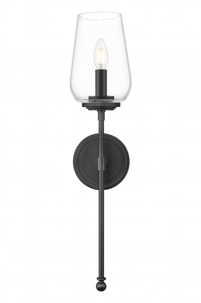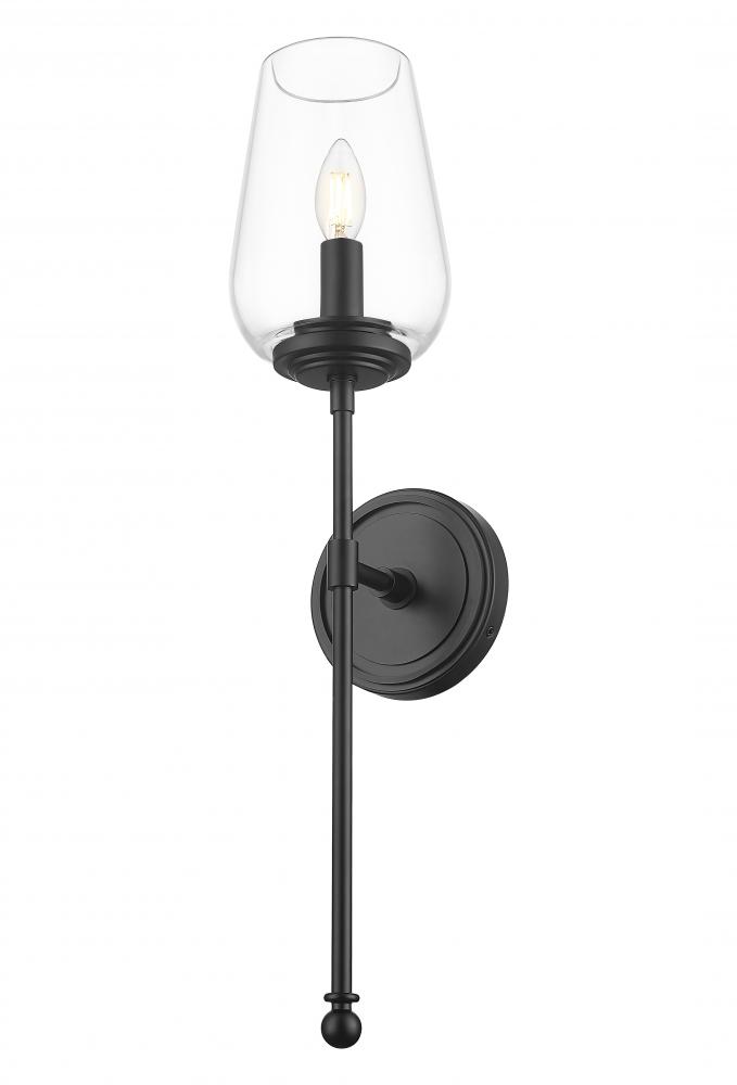 Matte black finishing lends bold contrast and depth to the clean, classic lines of a transitional one-light wall sconce. Its long stem is graceful and delicate, while a clear glass diffuser is inspired by a brandy snifter, offering wonderful elegance and timeless grace. Its a gorgeous addition in a powder room, entry or living area.