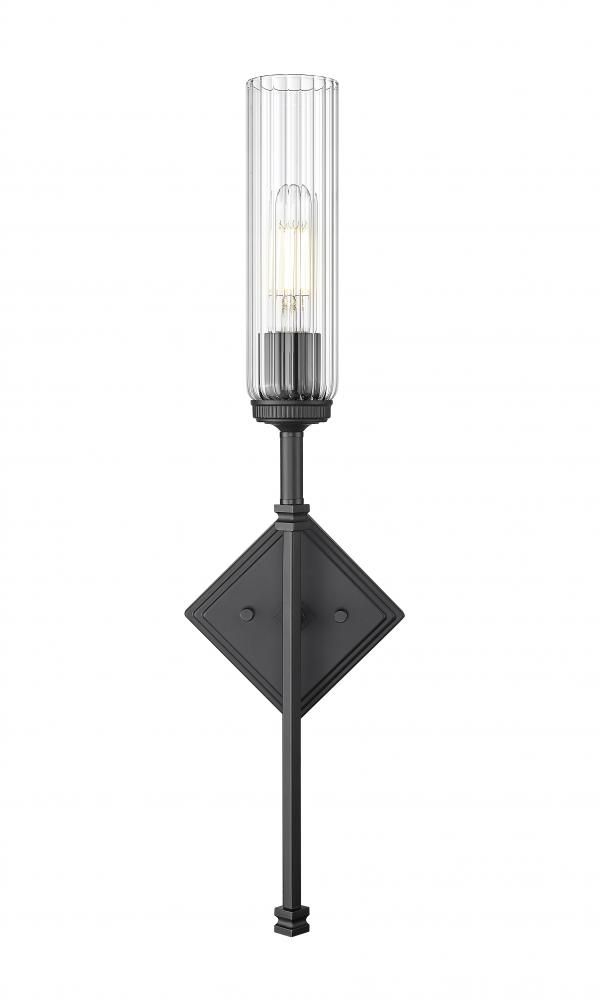 Delicate design evokes a champagne flute, with a slim stem and narrow fluted glass that diffuses illumination to reduce glare. A matte black finish offers excellent definition and detail, while stepped details on a diamond wall plate are a lovely touch. Add this charming design in a foyer or living area for exceptional ambiance.