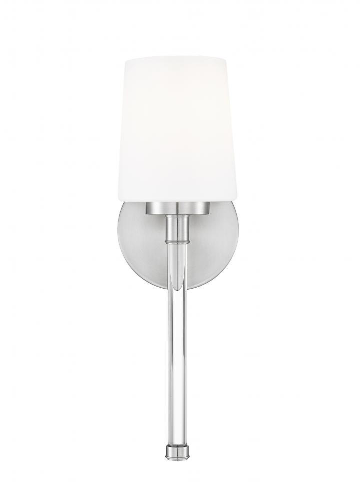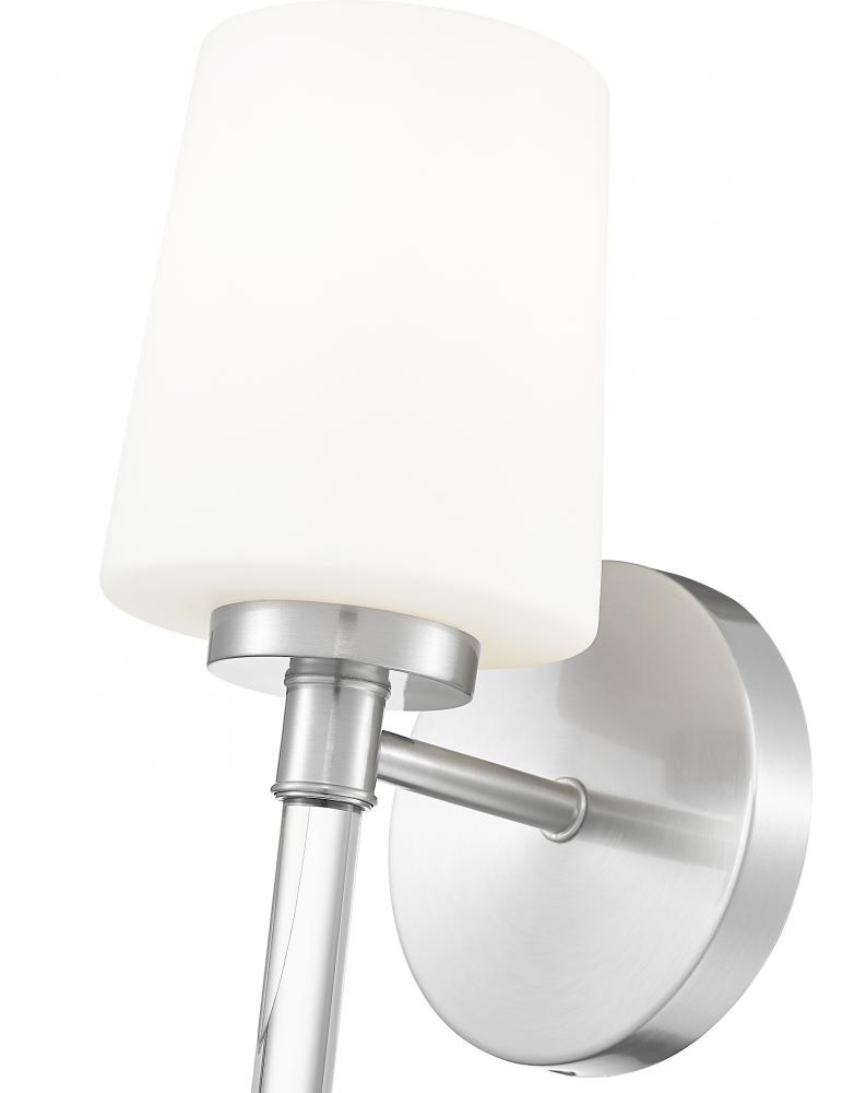 With its matching backplate and slender crystal stem, this brushed nickel one-light wall sconce feels like a modern candleholder lifted onto the wall, bringing the glint of metal and glass to a simple painted surface. The white opal shade turns bright bulbs into mellow, flattering light that softens mirrors and tile to make a bathroom, bedside corner, or hallway take on a gentle evening glow. Place it singly for a subtle accent or line up several along a vanity, and this versatile fixture anchors the space with an easy, everyday elegance.