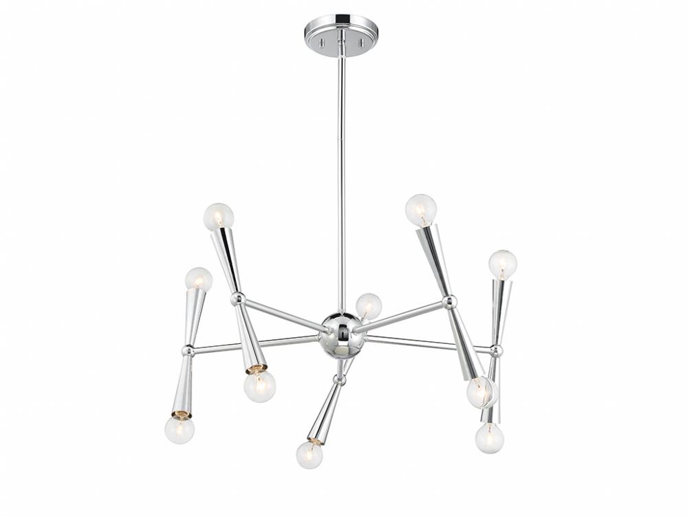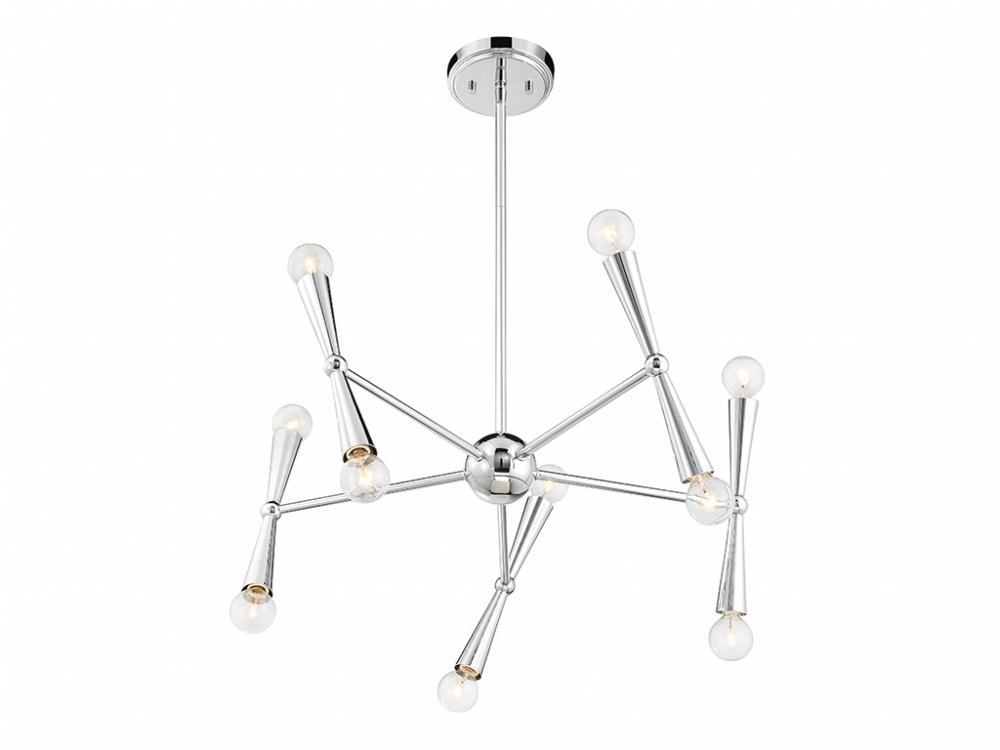 Make a scene with the unique silhouette of this 10-light chandelier! Cone-shaped arms finished in Chrome burst forth from the center, jutting out at jaunty angles and bearing bare bulbs to let the light shine brightly. This chandelier is 24" in width and has an adjustable height ranging from 10" to 64". Comes with four 12" downrods and one 6" downrod. Uses 10 candelabra size bulbs of up to 60 watts per bulb. We recommend using globe-shaped bulbs for heightened appeal. Bulbs not included.
