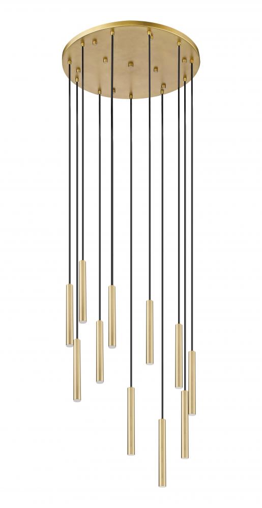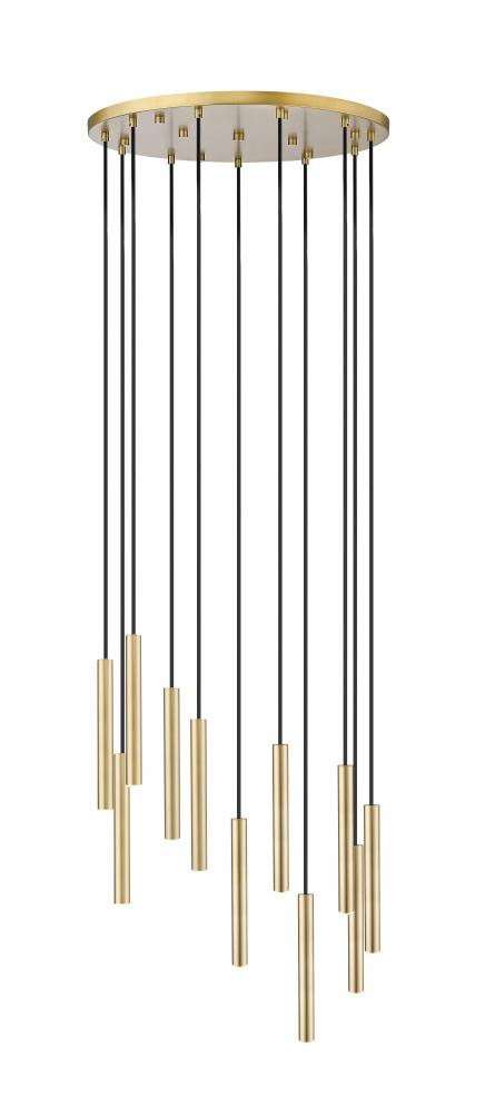 Instill a sense of drama and depth over a staircase or foyer with this modern 11-light chandelier. Its a clean, precise design that pairs staggered hanging heights with integrated LEDs that are both dimmable and energy efficient. Its round canopy and slender light housings showcase a modern gold finish, adding the perfect dash of warm sophistication.