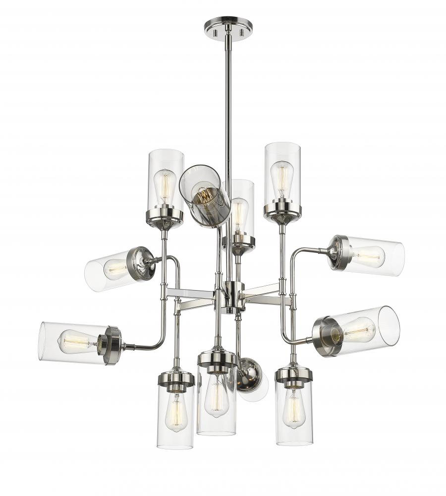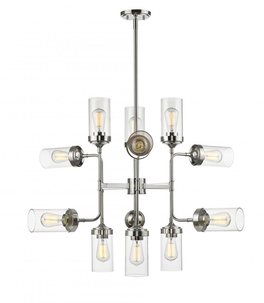 Imaginative and inspiring, the design of this industrial-themed 12-light pendant delivers a one-of-a-kind d?cor accent and plenty of radiant illumination. Enjoy the vintage feel of a hardware look presented in a polished nickel finish frame and canopy, and a dozen sleek cylindrical clear glass shades.