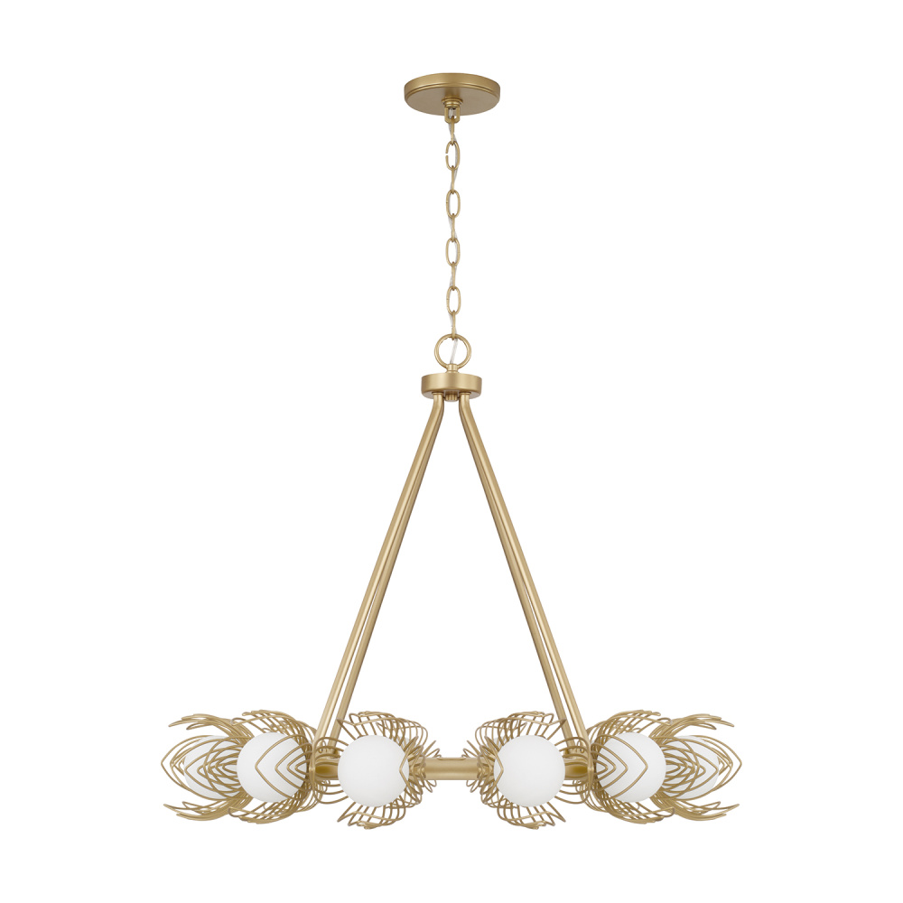 Romantic and artful, the Flora Medium Chandelier exudes botanical charm in a classic ring silhouette. Soft White glass globes are enveloped by a florla motif of delicate bent wire petals, finished in our signature Buffed Gold to bring a vibrant, warm hue to this showstopping style.