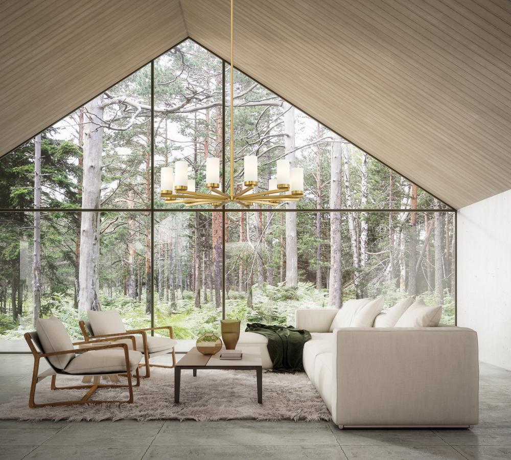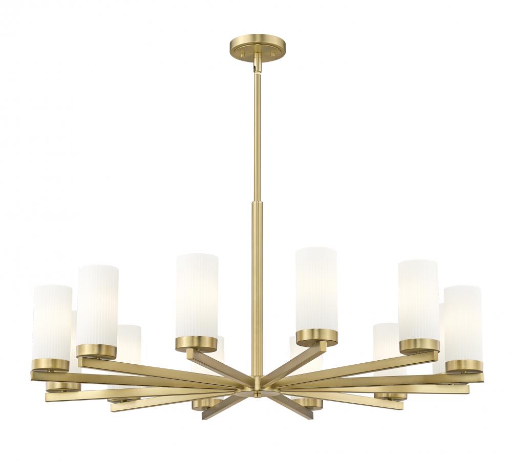Straight radial arms host hurricane shades crafted in frosted white glass in a modern 12-light chandelier. Chic and warm in modern gold, the fixture creates a fresh but refined ambiance over a dining table or entryway.
